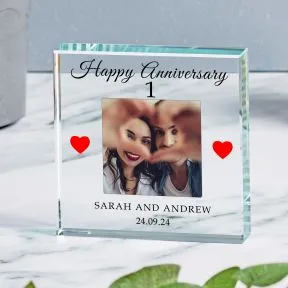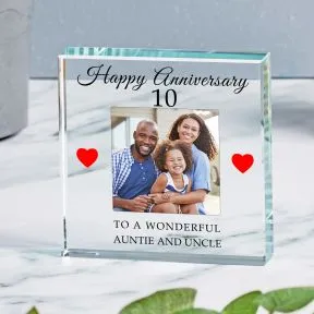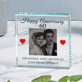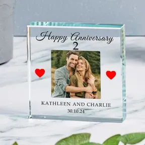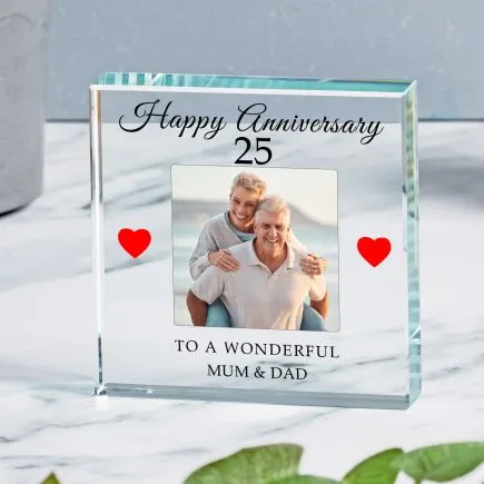 The perfect gift to to celebrate a special anniversary. Made from premium glass it is the perfect, modern way to display a favourite photo. Personalise with your choice of anniversary, a favourite photo and a message of your choice to make a beautiful gift and keepsake. Supplied in a lovely organza gift bag. (Size 90 x 90 x 20mm)